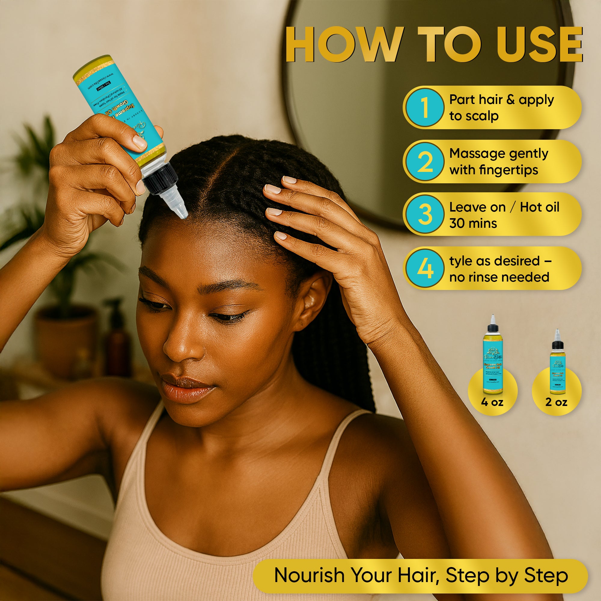 Use Apply to hair and scalp for supreme hair growth. Use 3–4 times per week without rinsing. Style as desired.
