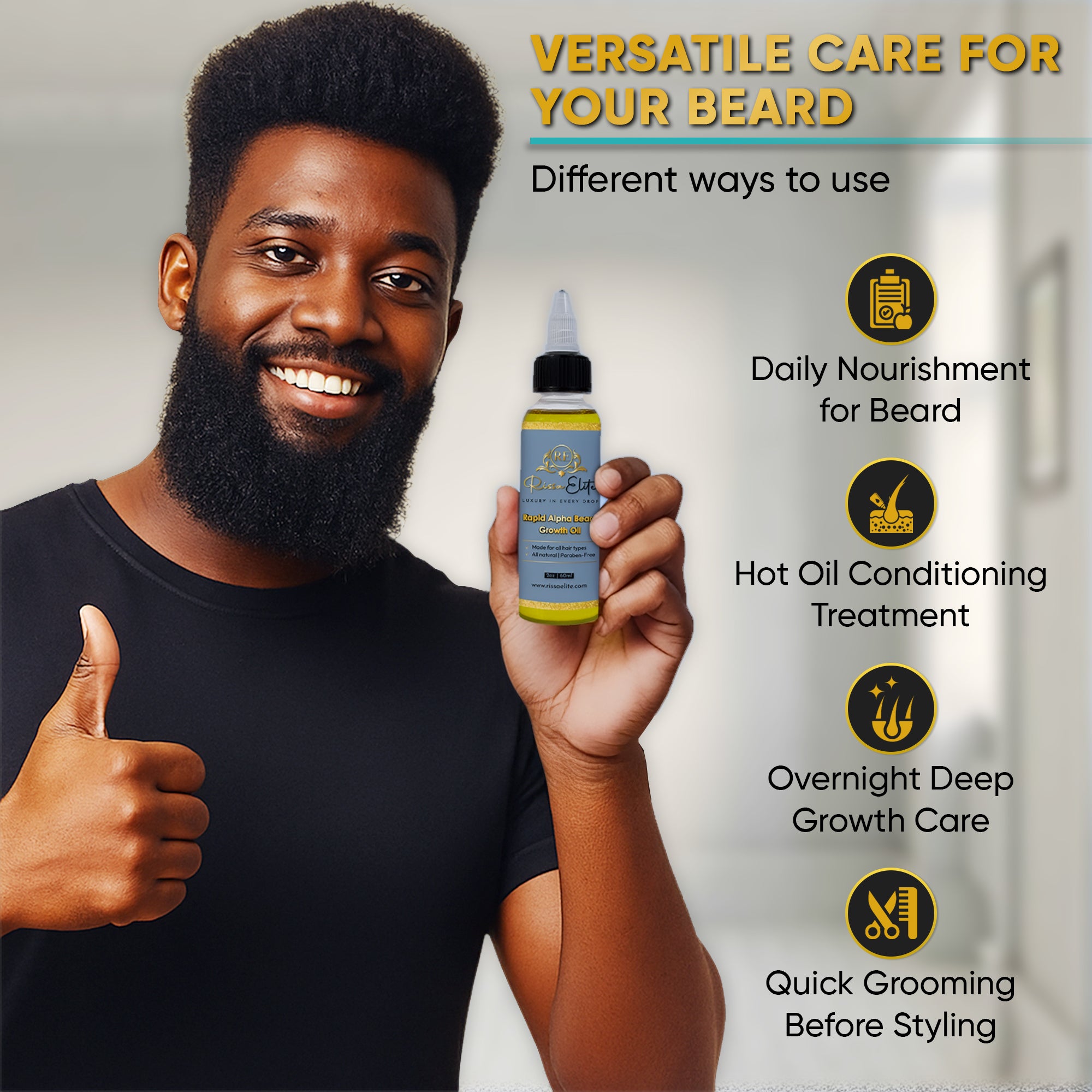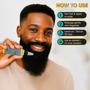 Apply on the beard to nourish and promote beard growth. Use 3-4 times per week without rinsing.