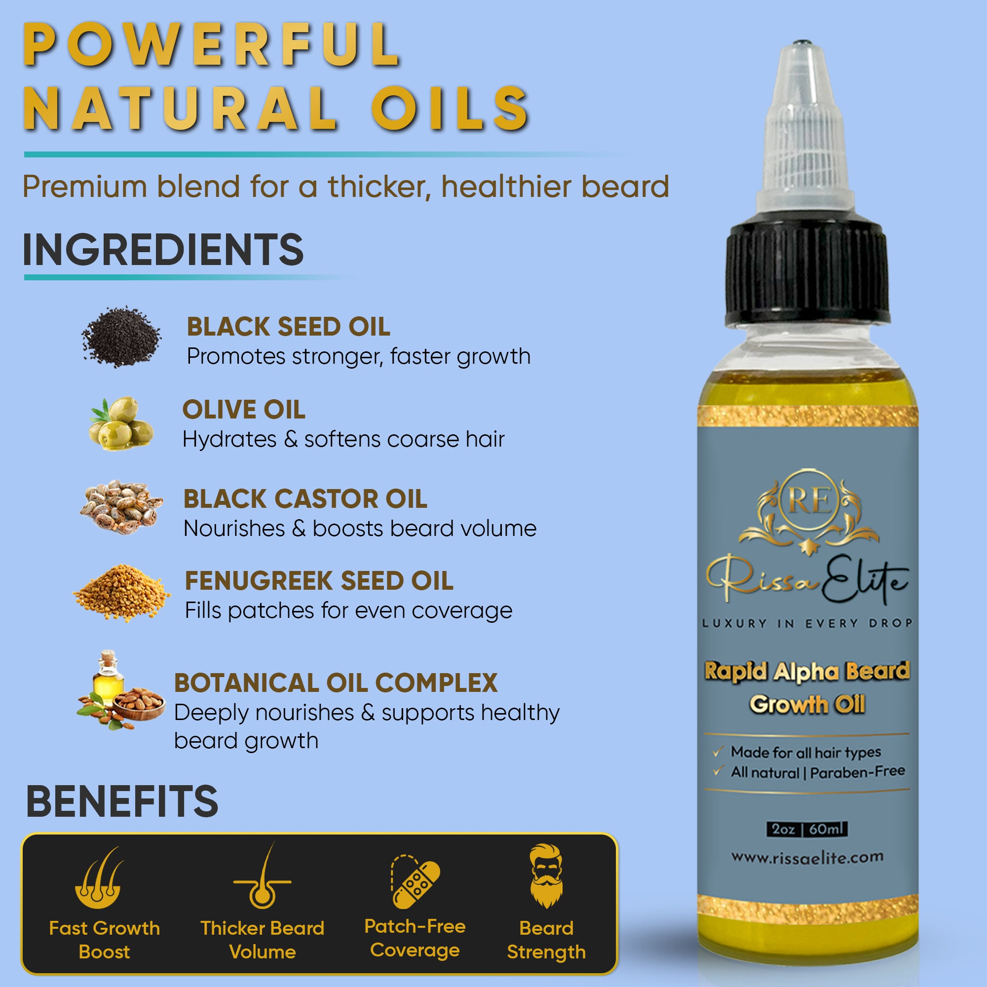 Nigella Sativa (Black Seed) Oil, Trigonella Foenum-Graecum (Fenugreek Seed) Oil, Ricinus Communis (Black Castor) Seed Oil, Botanical Oil Complex, Natural Essential Oil (Fragrance).