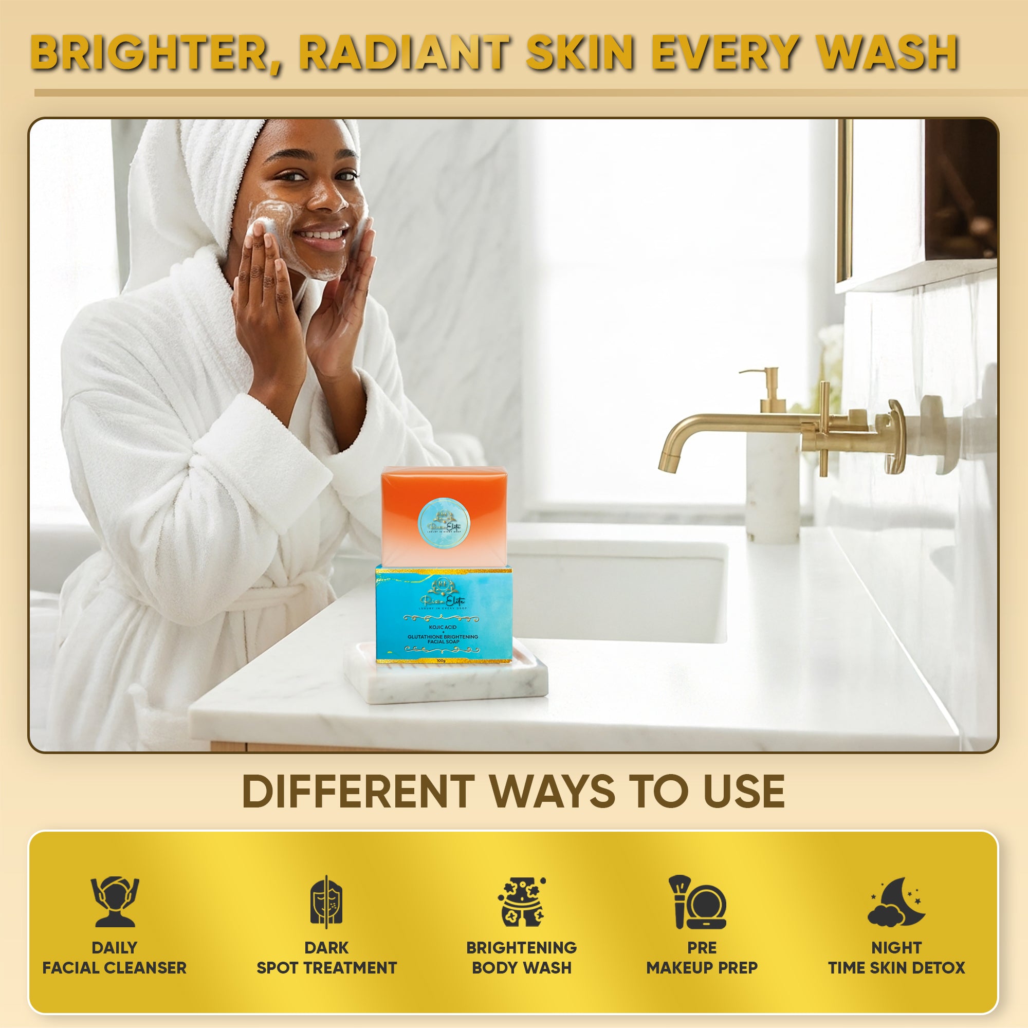 Reveal your glow with this luxury brightening bar. Formulated to gently fade dark spots, hyperpigmentation, and uneven tone, it deeply cleanses while nourishing the skin. Infused with Kojic Acid, Glutathione, and soothing tea tree oil, it leaves your skin smooth, radiant, and visibly refreshed after every wash.
